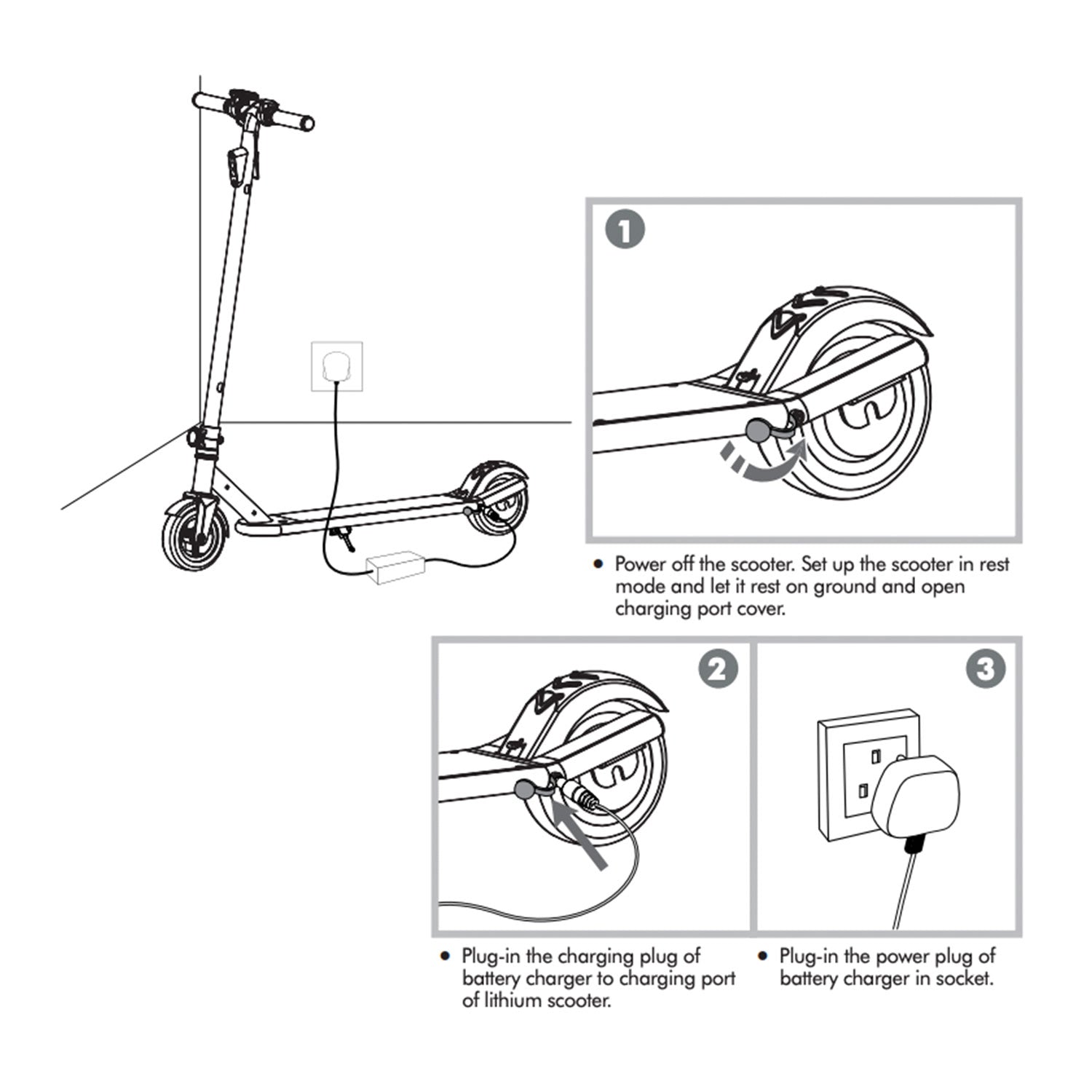 9) There is CHARGING PROTECTION and the lithium battery will not be charged when the temperature of lithium battery is hot (e.g. 50 degrees or after extended period of riding). If this happens, switch off the lithium scooter, wait for 30 minutes and let the temperature of lithium battery cool down. Then plug-in the charging plug for charging again.