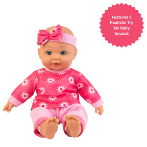 Dressed in a charming pink outfit with delicate floral details and a matching headband, this lovable doll is as stylish as she is huggable. With a soft body that’s perfect for little arms to hold and carry, she also features five interactive sounds—simply press her tummy to hear adorable giggles, babbles, and baby sounds. Whether it’s bedtime, playtime, or an on-the-go adventure, she makes the perfect companion for any child.