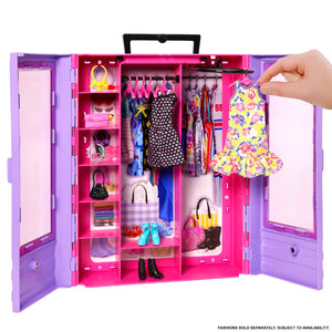 Get ready for a fashion adventure on the go with the Barbie Fashionistas Ultimate Closet! This fabulous closet is designed with Barbie's signature style, featuring a chic purple exterior and a pretty pink interior with translucent doors to peek inside. It comes with six hangers to keep your Barbie outfits neatly organised, and the spacious shelves are perfect for storing amazing accessories (accessories not included). The fold-out rack makes dress-up style changes a breeze, and you can even store a doll inside the closet (doll not included).