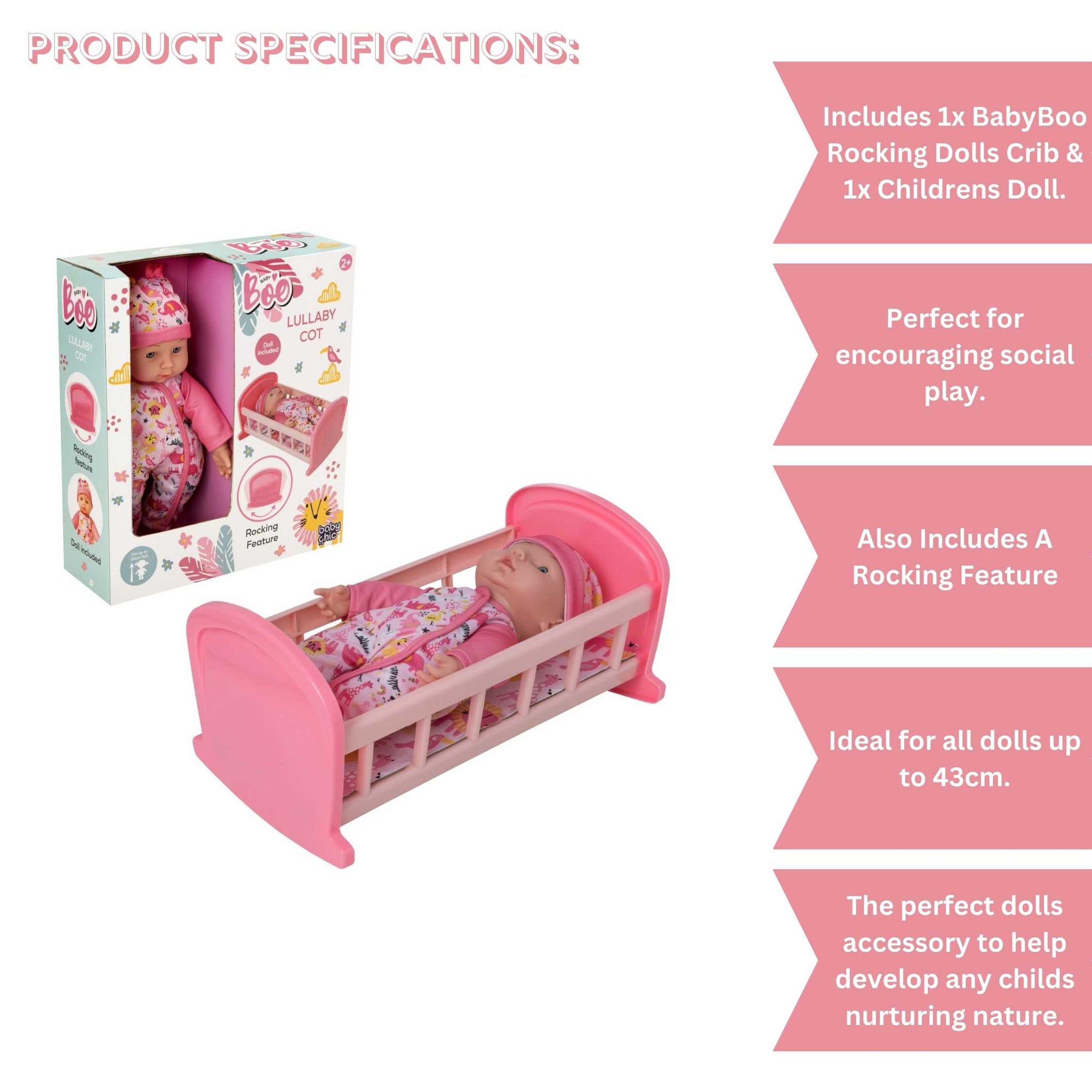 Ready to transform bedtime into a magical experience? Introducing the BabyBoo Dolls Lullaby Cot – where dreams come to life and snuggles are endless! Wrap your kiddo's favourite dolls in a world of comfort with our adorable Lullaby Cot. Crafted with love, it's the perfect cosy spot for naptime or bedtime stories.