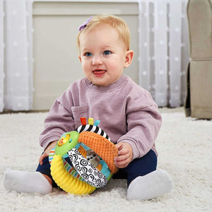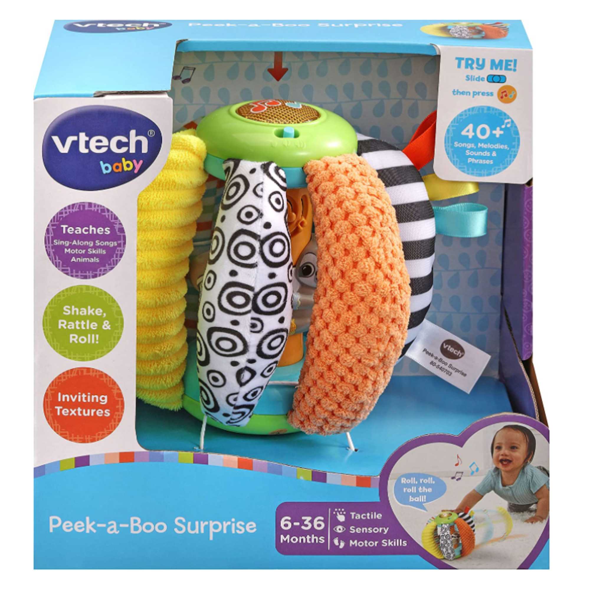 Wiggle, giggle and roll, roll, roll Sloth and her baby with Peek-a-Boo Surprise by VTech! Press the light up button on top to introduce fun phrases, sing-along songs and melodies. Roll Peek-a-Boo Surprise to trigger the motion sensor and hear silly sounds and phrases. Watch little ones reach, crawl or walk after it! This soft, squishy toy is easy to grab and hold. Smooth, ridged and bumpy textures and bright colours enhance tactile stimulation.