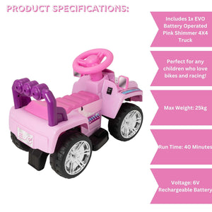 The EVO Shimmer 4x4 Ride-On Truck (Pink) is more than just a toy; it's an adventure on wheels that provides endless fun and excitement for your child. With its stylish design, powerful performance, and engaging features, it's the perfect addition to any playtime.