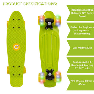 Picture this: gliding through the streets as your board lights up the night with vibrant LED colours, turning heads and spreading smiles wherever you go. With its sleek design and compact size, this Penny Board isn't just a mode of transportation; it's a statement. But wait, there's more! Crafted from high-quality materials, the EVO Light Up Penny Board isn't just about looks – it's built to last. Whether you're cruising to class, hitting the skate park, or just exploring the neighbourhood, this board is up for any adventure you throw its way. Safety first, right? You bet. The EVO Light Up Penny Board is designed with your well-being in mind, featuring reliable LED lights that not only look awesome but also keep you visible and safe, day or night.