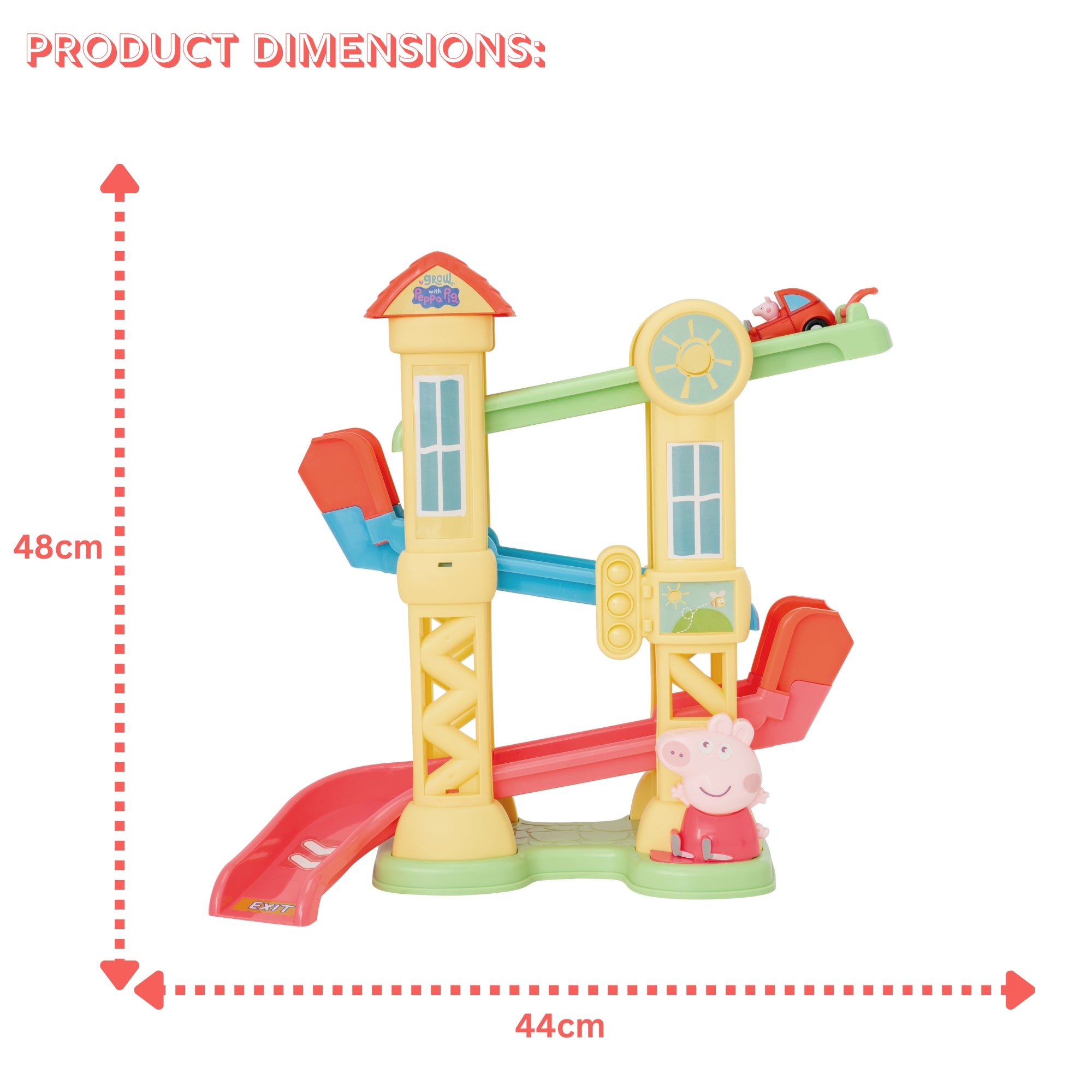 • Includes: 1x Peppa Pig Tumbling Tower Car Track Playset & 1x Freewheeling Car