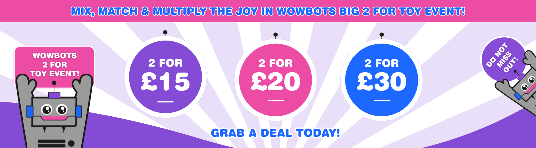 WOWBOT knows that two is better than one, and he's making it easier than ever to build your ultimate duo. Forget confusing discount codes or complicated BOGO rules! We're simplifying your shopping experience by offering TWO amazing toys for one low, fixed price. Look out for the symbols, add 2 items to basket and let WOWBOT do the rest!