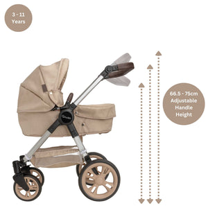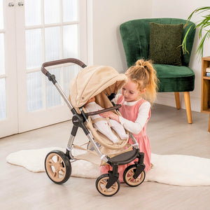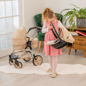 Picture your little one's face lighting up as they embark on exciting adventures with the Celuna Premium Dolls Travel System. This isn't just a toy; it's a gateway to a world where playtime seamlessly integrates with the convenience of a well-designed travel system. Effortless fun is just a stroll away! This Celuna Premium Dolls Travel System transforms from pram to pushchair mode and can be forward or parent facing. The matching car seat attaches to the frame for push along play or can be used individually in upright chair mode. To keep your baby dolls safe the Celuna has straps for both seats and includes under seat storage for all your dolls accessories. Infuse a touch of style into your child's playtime travels! The Celuna Premium Dolls Travel System boasts a chic design that mirrors real-world elegance. It's not just a toy; it's a fashion-forward accessory that transforms every stroll into a stylish affair.