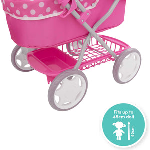 Crafted with care and attention to detail, the Dolly Tots Junior Dolls Pram is the perfect introduction to the world of nurturing play. Watch as your child's face lights up with joy while they discover the wonders of caring for their favourite dolls in this charming, pint-sized pram. Specifically designed for the youngest doll enthusiasts, the Dolly Tots Junior Dolls Pram is just the right size for little hands to push and manoeuvre effortlessly. Lightweight and easy to push, this pram encourages motor skills development, allowing your child to explore their surroundings with their beloved dolls in tow. Fostering nurturing qualities, the Dolly Tots Junior Dolls Pram nurtures empathy as your little one takes on the role of a caring caregiver for their dolls.