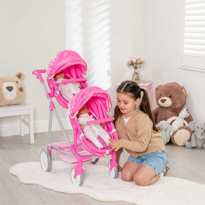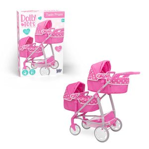 Designed with precision and care, the Dolly Tots Twin Dolls Pram is the perfect accessory for your child's budding imagination. Watch as they embark on twinning escapades, nurturing their dolls with love and laughter. The Dolly Tots Twin Dolls Pram is specially crafted to accommodate two dolls side by side, creating a shared experience for siblings, friends, or a doll-loving duo. With swivel wheels for easy turning and a sturdy frame, the Dolly Tots Twin Dolls Pram ensures a smooth ride for both dolls, encouraging hours of interactive play. Through shared play, children develop essential social skills, communication, and empathy, laying the foundation for strong friendships. The Dolly Tots Twin Dolls Pram provides the perfect canvas for imaginative storytelling and role-playing, sparking creativity and fostering a love for shared adventures.